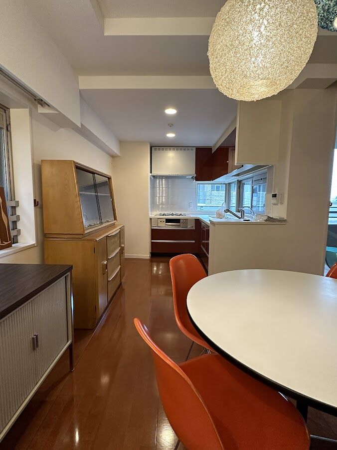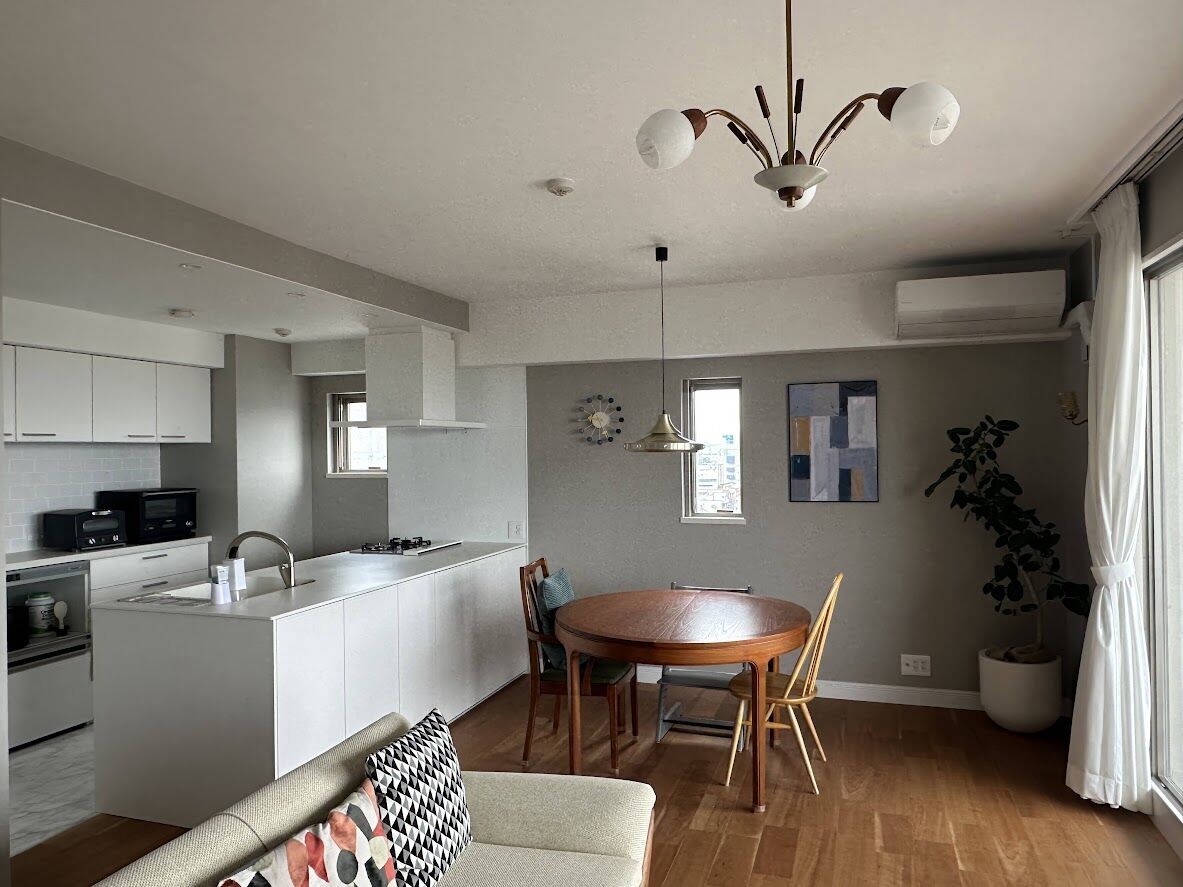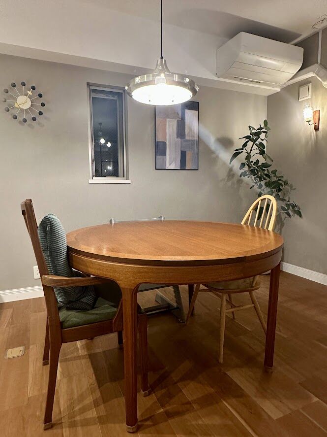 半年後、相性抜群の白天板のダイニングテーブルが加わり、ダイニングの輪郭が見えてきました。