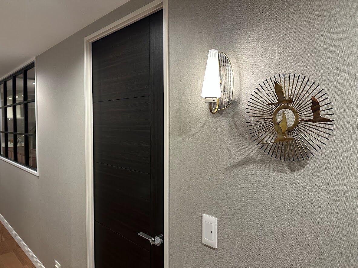 照明は小ぶりなマジェスティックランプを採用し、落ち着きと品のある光を演出。こちらの壁にもサンバーストクロックを掛け、統一感を大切にしました。
