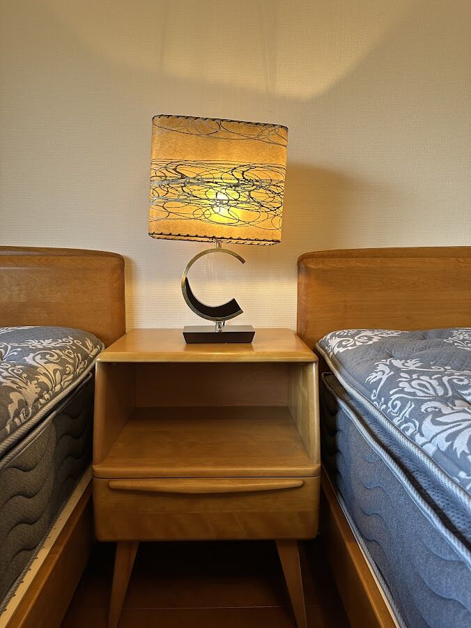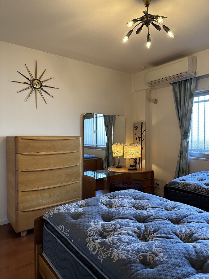 ツインのベッドフレームにチェスト、ドレッサーまで、統一感と温かみが漂います。寝るだけですが、目覚めたときの気分の良さは格段に違います。