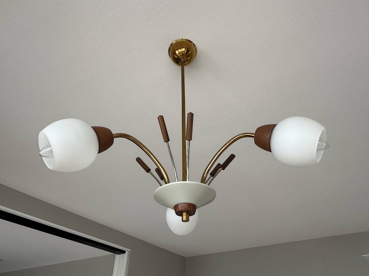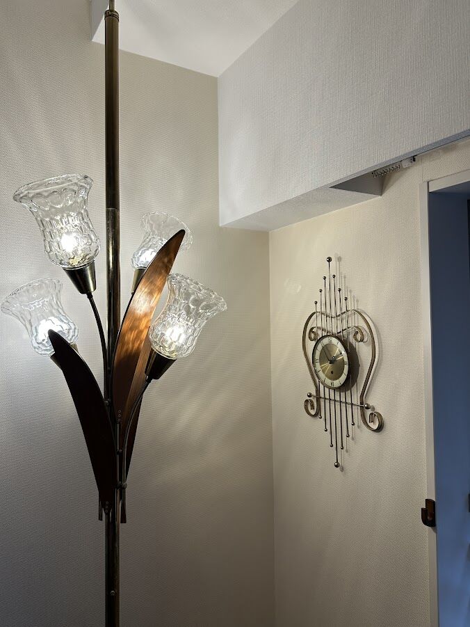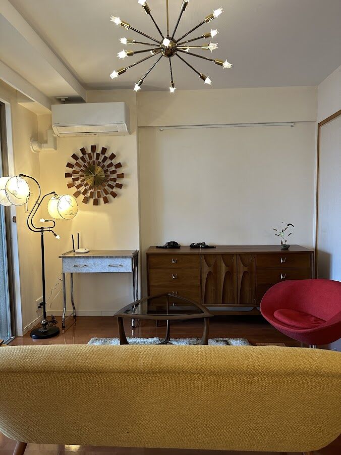 照明はまさにミッドセンチュリーモダンの象徴、スプートニクランプとマジェスティックフロアランプ。壁には存在感たっぷりのサンバーストクロックを掛けて、時を超えた佇まいに。