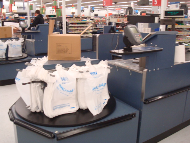 買い物した商品をレジの手前のベルトコンベアーに載せる。これだけでも最初に見たときは、楽しくて楽しくて。で、バーコードをお店の人が通してくれるのは日本も同じ。そのあと、そのままレジの人がこのレジ袋がたくさん引っかかった回転する台へと手を伸ばし、そのまま袋にINで完了。お客はその袋をはずして、持ち帰るだけというシステムです。