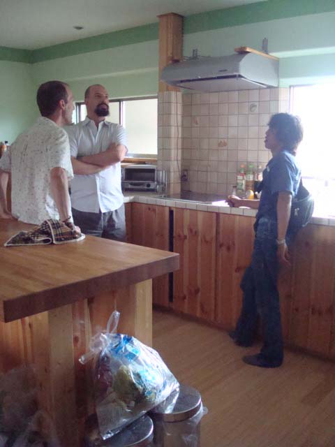 外国人のリフォーム業者。日本人にも人気がでそうですよね!ただ、サイズは外国人サイズ…。アイランドキッチンもシンクも全部、ご自分で製作。右側のウチの相方にはさすがにシンクの高さが高いですよね(笑)