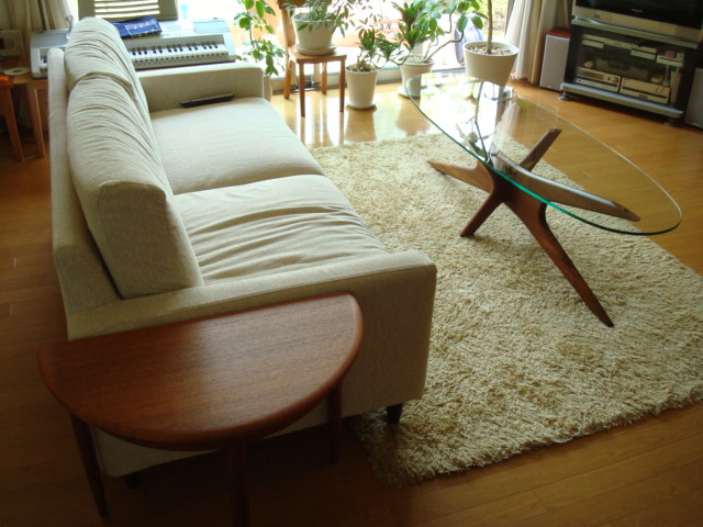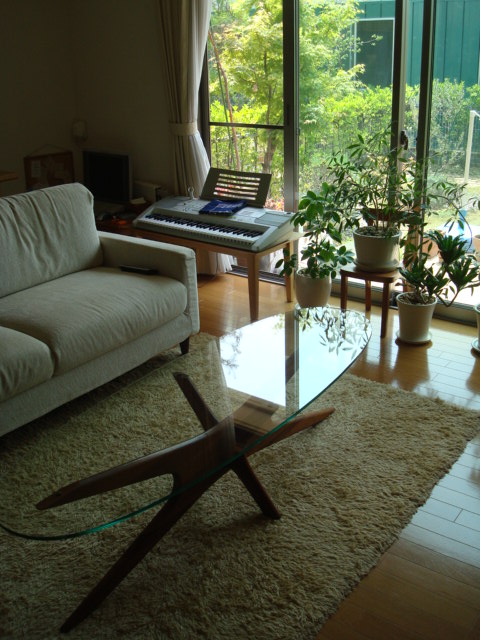 そんなご夫婦のリビングがこちら。脚の美しさに一目ぼれのガラステーブルを配達。木を人間の手で美しく表現したミッドセンチュリーモダンのデザイン力を、見せつけているテーブルです。