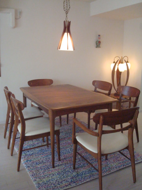 お一人暮らしにもかかわらず、一番最初に購入してくださった6脚付きのダイニングテーブルセット。その上にウッドにこだわったペンダントランプ。