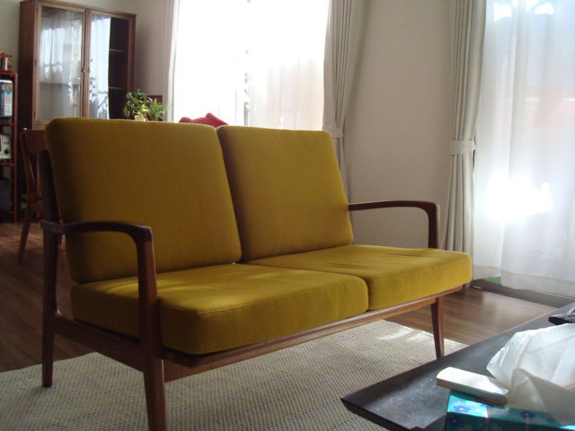 ダイニングチェアとソファの生地は、少しくすんだ黄色を選択。明るく落ち着いたイメージに。