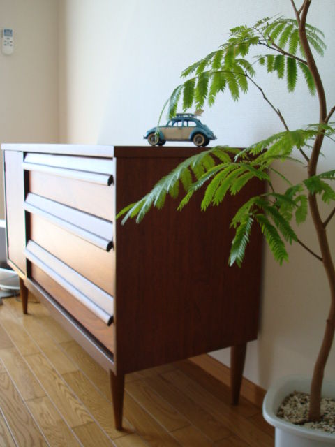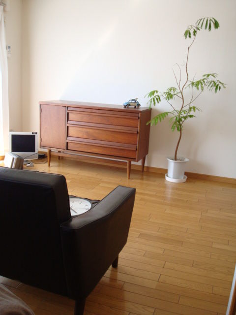 若い男性の一人暮らし部屋。この日はサイドボードをお届けに伺いました。そして、後日、イームズのダイニングテーブルとチェアもお買い上げいただきました。