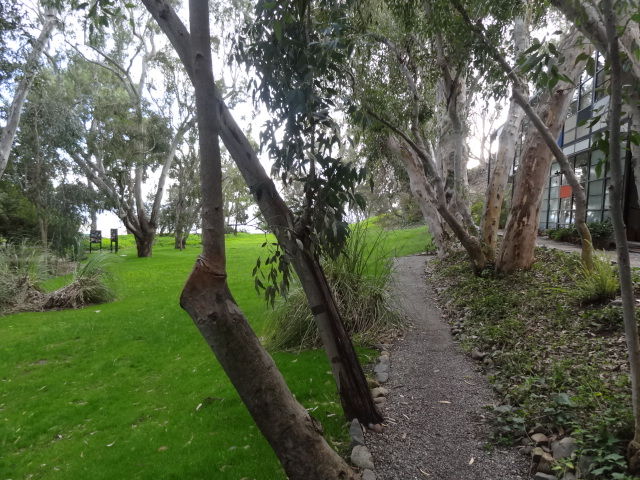 庭にも大きな木が所々にあって、建物を眺められる位置の大きな木にはブランコが掛けられていました。庭の先の案内板の向こう側にも、遊具が設置してありました。遊び心が豊かな夫妻が設けたのでしょうね。