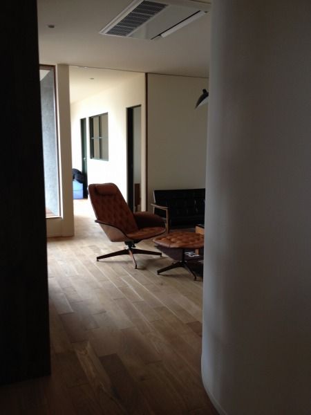 キッチンを中心に設計された間取りで、キッチン右側のオープンスペースは書斎。そこに以前お買い上げくださったイームズセット&アルミナムチェアを。
