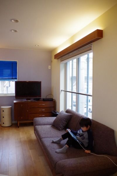 オーダーメイド家具を背に、キッチン側からリビングを見たところ。こちらのペールグレイッシュなブルーの壁の色はわたしがパースに書いた絵を参考にしていただいて決まった色。リビングの2面の壁がこの色です。