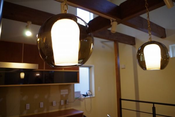 ダイニングテーブルの上部には、シブーイ色のスモークガラスのペンダントランプを2つ。内側もガラスで、写真より実物はもっと透明感があってグッと来ます。