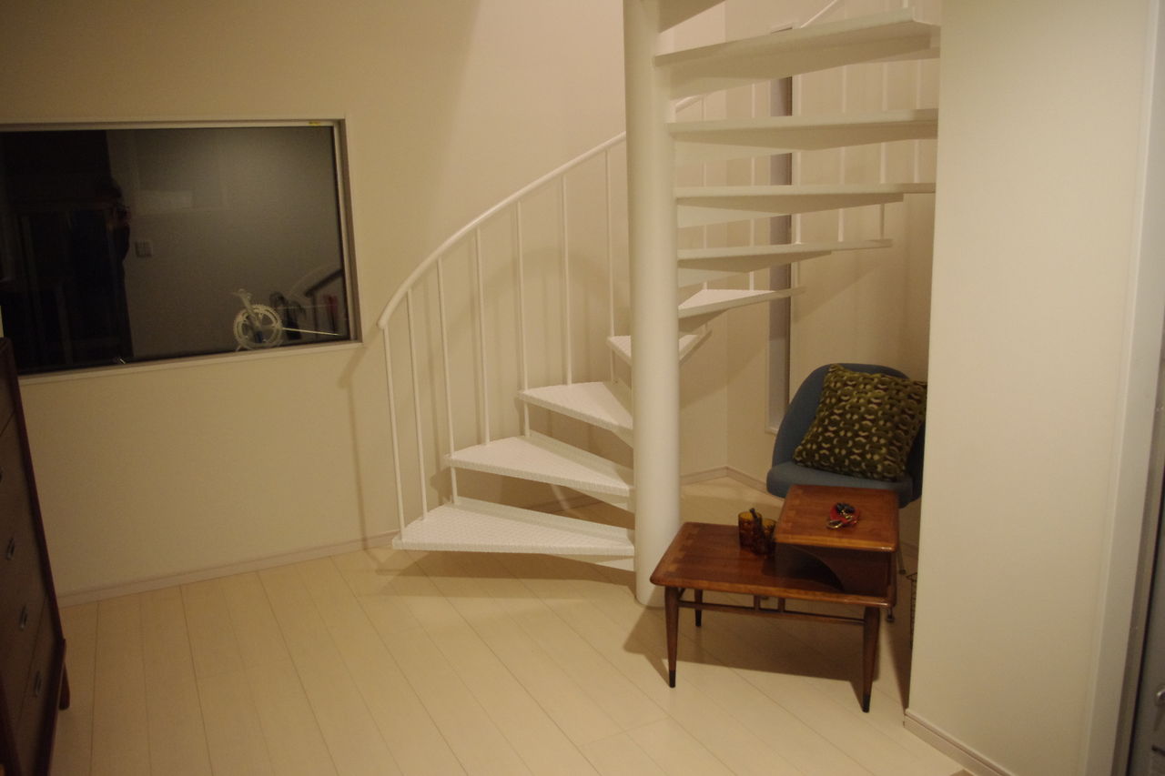 玄関ホールの螺旋階段下には、パームスプリングスからのノールチェア。その椅子を移動して内窓からはガレージがのぞけます。