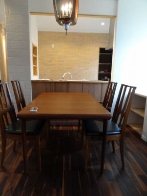 ブラジリアのチェアとダイニングテーブル、その上にモダンなシャンデリアが渋く光ります。