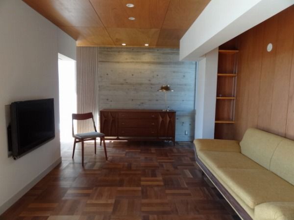 リビングは、コンクリートの壁と木をバランスよく取り込んで、やさしい雰囲気ですね。ブラジリアのサイドボードはリビングに置くことを先に決めて、プランニングしていただいたそうです。