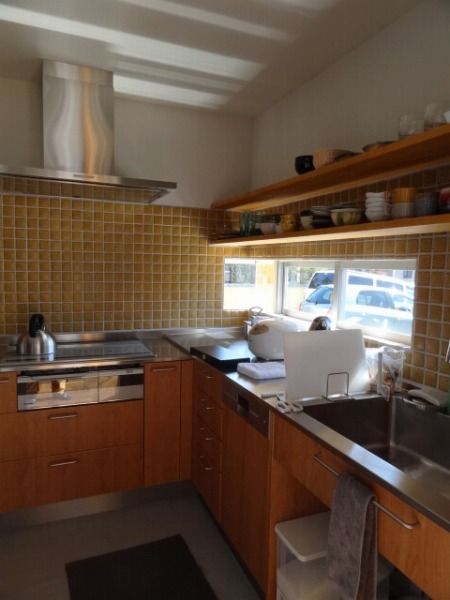 リビングに生活感を引き込まないようにした独立したキッチンには、やさしい風合いのタイルが貼られて、ここはここでとても居心地がよさそうです。