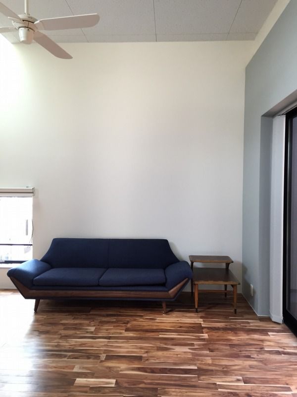 こちらもうお馴染になりました、オリジナルソファー(ネイビー)とレーンのステップエンドテーブルを2階リビングに設置。