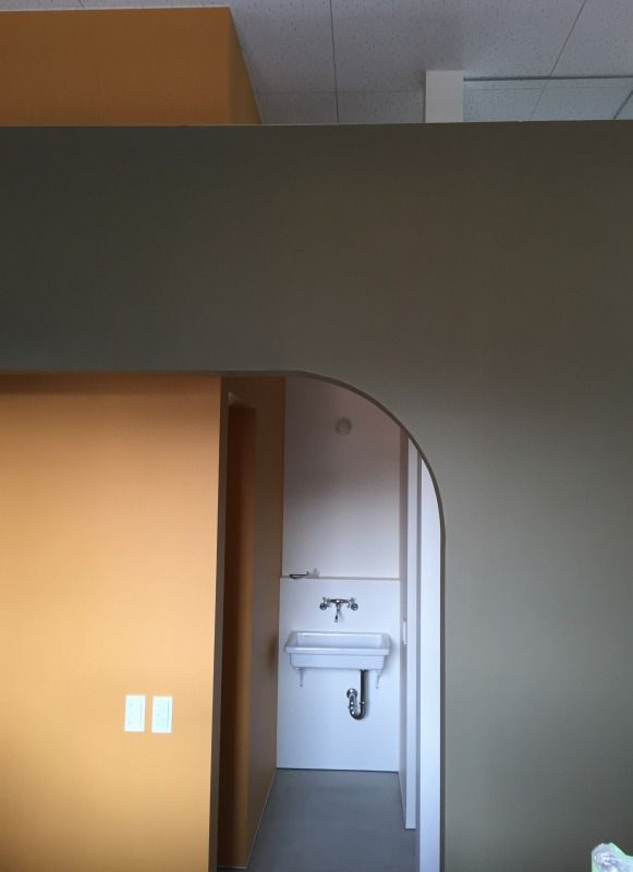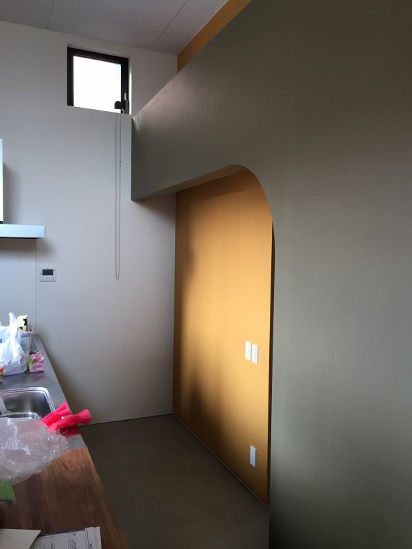 実はこの辛子色の壁に、カップボードを設置する予定でしたが、ガラスの踊り場を通過できず、後日お引越し時に吊りあげしてもらうことになりました。