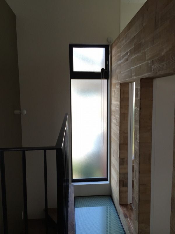 壁上部は採光用と、踊り場(中二階)から二階天井までのそそり立つ壁の圧迫感の軽減で、FIXのガラスになっています。