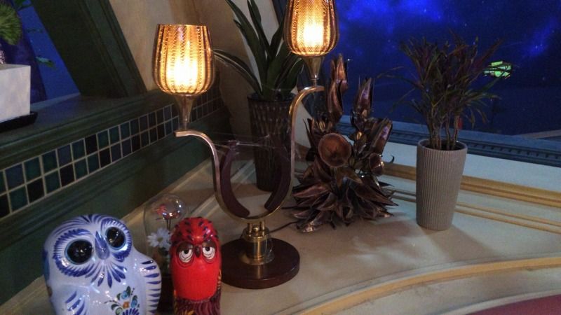 ランプの奥の、ビジャン・J・ビジャンの花のスカルプチャー。