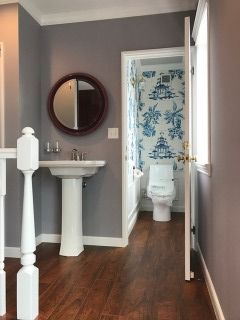 登って左手にトイレと洗面。こちらは憧れのコーラー社製の洗面を配置。木フレームのラウンドミラーが1階のモールディングとリンクしています。
