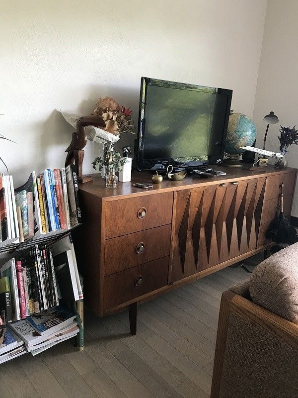 リビングに戻って、ソファーの向こう側にカッコイイサイドボード(テレビは添え物程度に)。