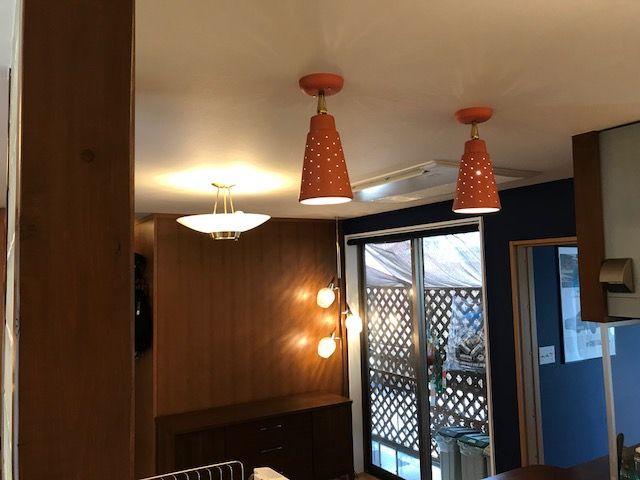 キッチン前のスペースにサイドボードと突っ張りポールランプ&シーリングランプも。サイドボードの上や壁面をどう飾るか、、腕の見せ所ですね。