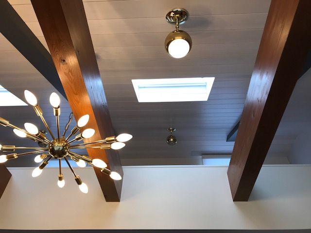 上を見上げると、天井はこんな感じ。一部吹抜けになっていて梁の上の天井を板張りに。と共に、照明もリニューアル。ダウンライトはあえて使わず、ドラえもんのしっぽみたいで可愛い!
