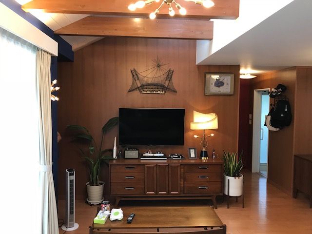 壁はミッドセンチュリーハウスのオープンハウスにいらっしゃって、これだ!ということで、突板の壁にされたそうです。