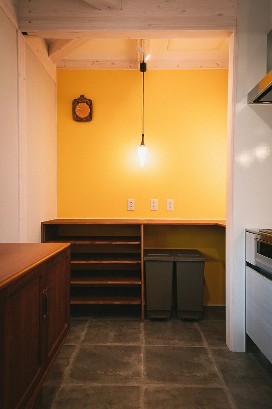カウンター上と家電スペースの照明は3連のものをバラシて取付け。統一感がありますね。