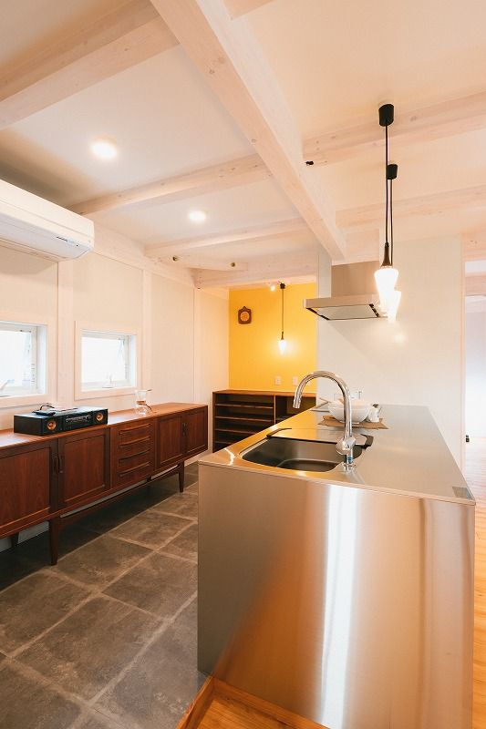 梁や柱を出した壁天井に白い塗装が施され、陰影がでてリズム感のある内装に、イギリスヴィンテージを中心に揃えられました。
