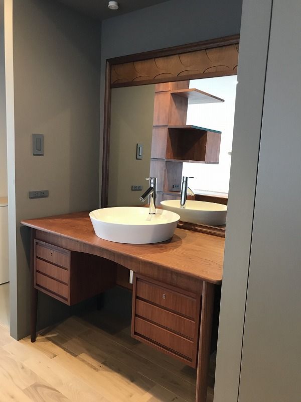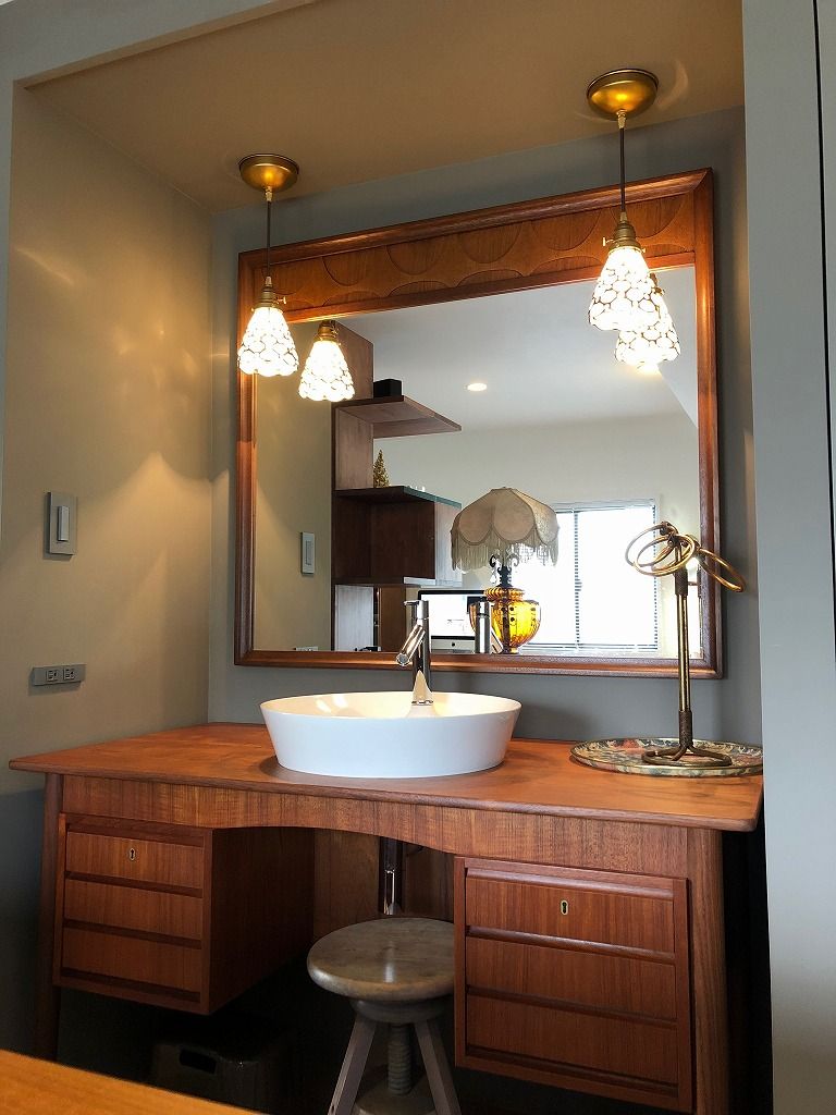 まずはこちら。洗面台にビンテージのデスクを使用するという大胆な発想でできたこちらの空間。ブラジリアのミラーも背面に付けていただいて素敵な手洗いスペースが出来ています。