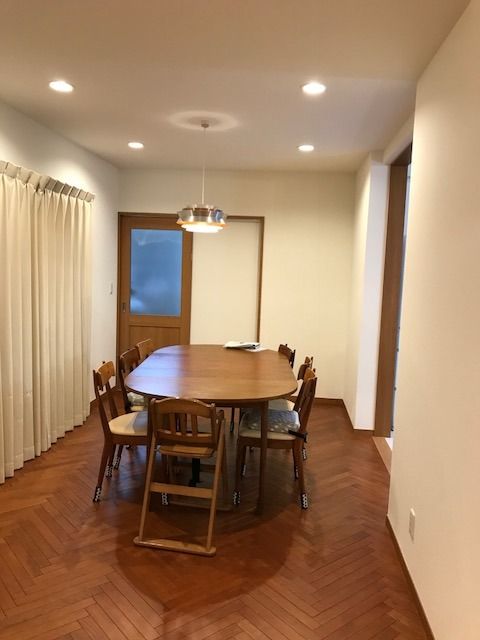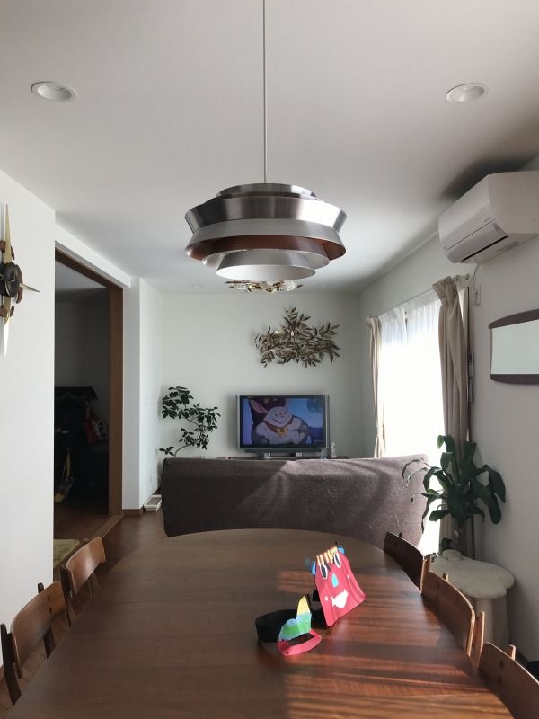 前はLDKが一直線につながった間取りで、以前お買上げいただいた照明やテーブルは程よく収まっていたのですが、今回の変化でほぼ倍の広さになったことで少し間延びしてしまいご相談を受けました。
