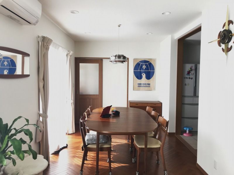奥の扉は親世帯への出入り口なので、共有のダイニングを一番近いスペースへ。少し寂しい空間になっていましたので、3段チェストとポスター、ミラーで肉付けさせていただきました。