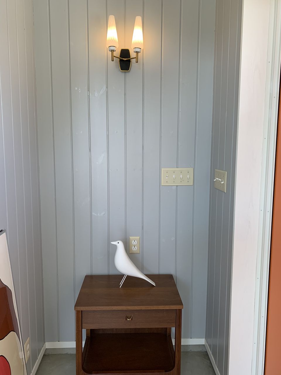 ナイトスタンド+ブラケットは手軽にチャレンジしやすいニッチスペース活用法。オブジェやグリーンでアレンジしやすいのも良いですね。