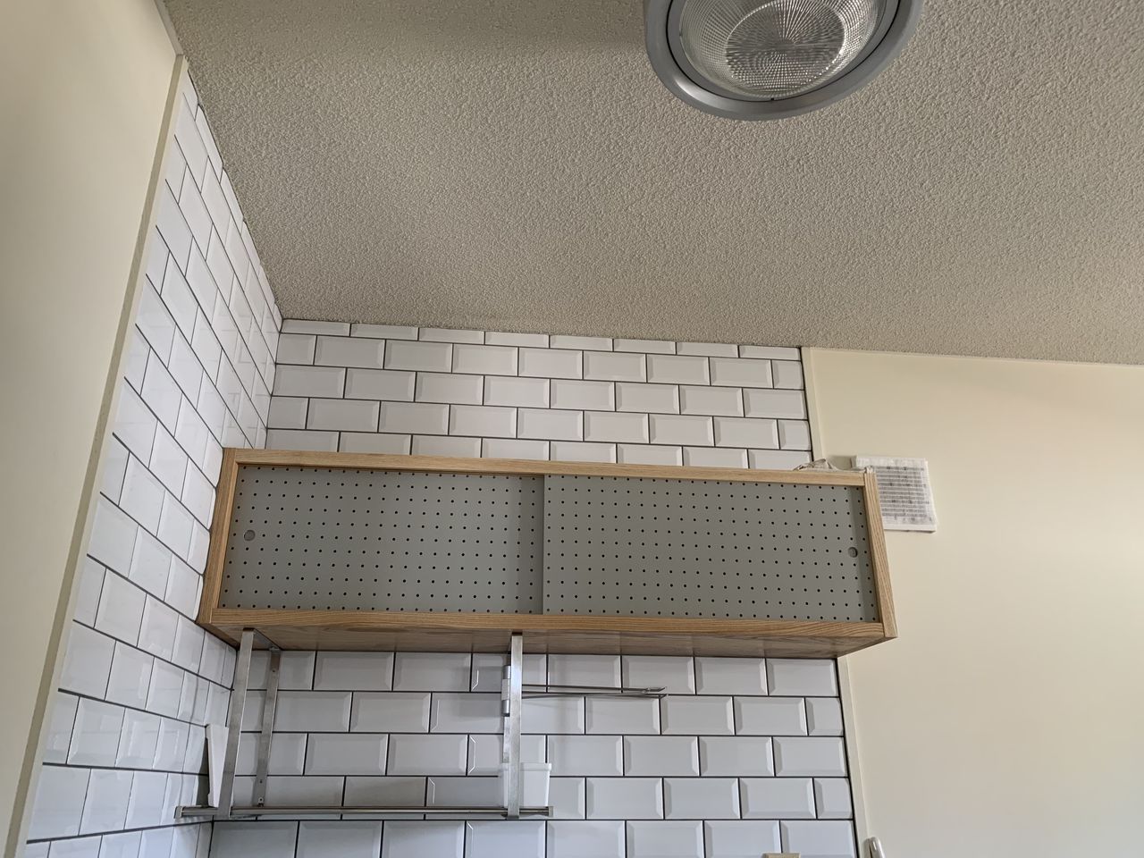 背面は造作の棚だそうで、ペグボードをつかった扉がおしゃれ!給湯室のミニキッチンの収納部も同じ作りになっていて、スモークブルーの色合いといい、かなり可愛くしあがっていました。