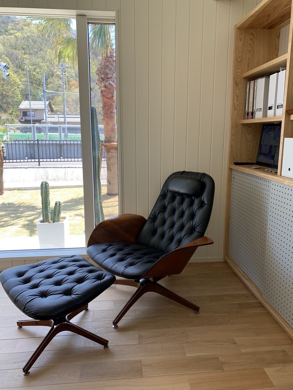 事務所スペースの奥はプライクラフトのMr.チェアでラウンジ空間を。職場にいながらラウンジチェアにもたれて素敵な庭が眺められるなんて、、すてきすぎる。