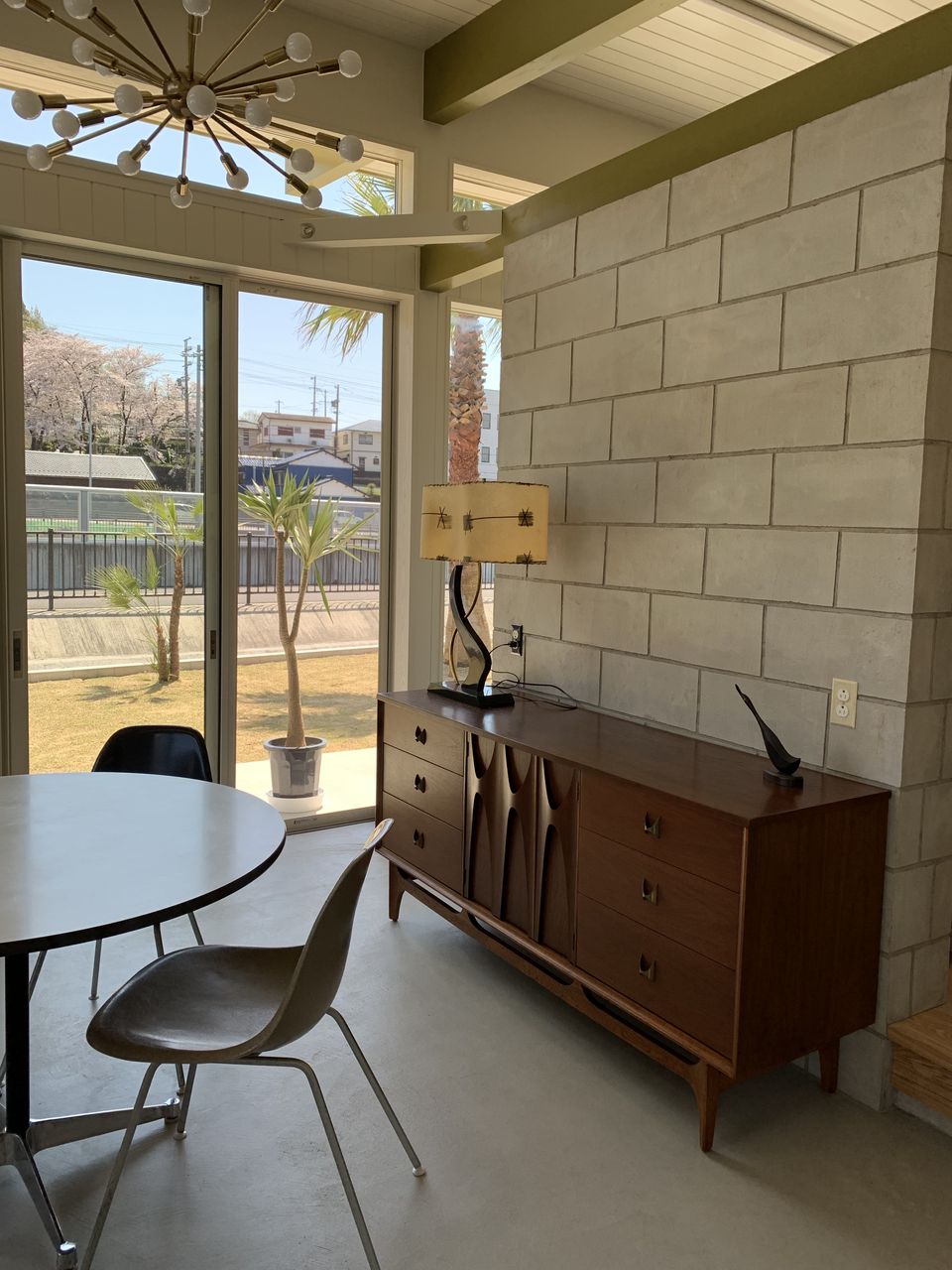 ブロック壁の前にはブラジリアサイドボードとマジェスティックランプを。シンプルな背景によく映えます。