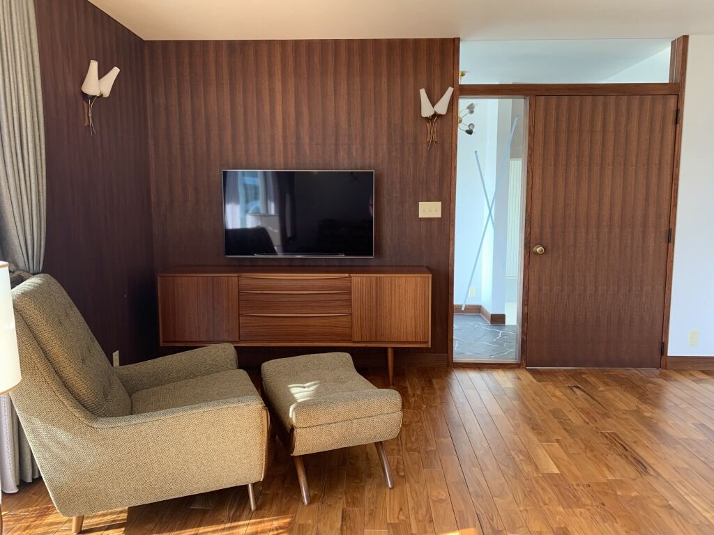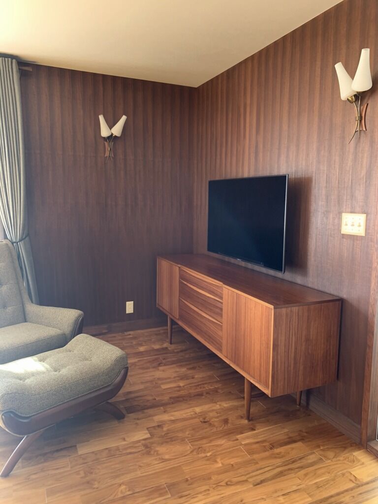 奥の部屋は、シングルソファとシェードランプを置いて大画面で映画を楽しむ映画部屋もあります。ここにエイドリアンシングルソファを設置予定です。