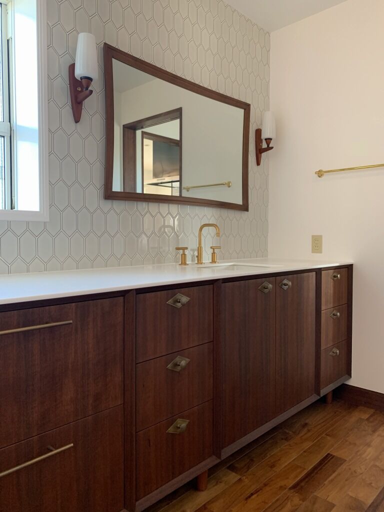 キッチンからは水回りへのアクセスも近道。洗面スペースは、ミラーとブラケットランプを付けていただきました。合わせてデザインしていただいた造作家具は来客も使う洗面で、自慢できるカッコよさです。