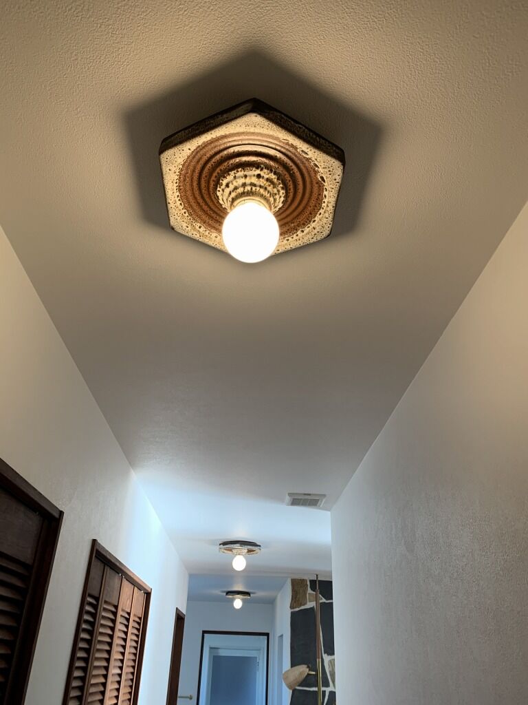 振り返ると廊下は風呂場まで直線の長い距離があり、連続した陶器のシーリングランプが付いています。