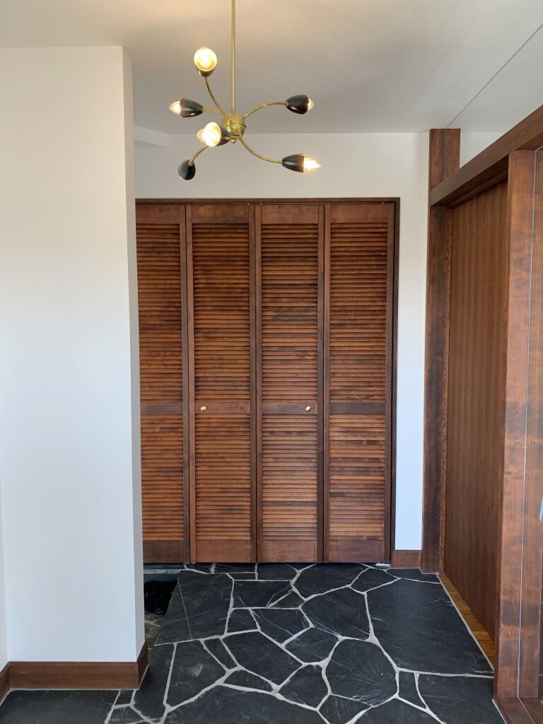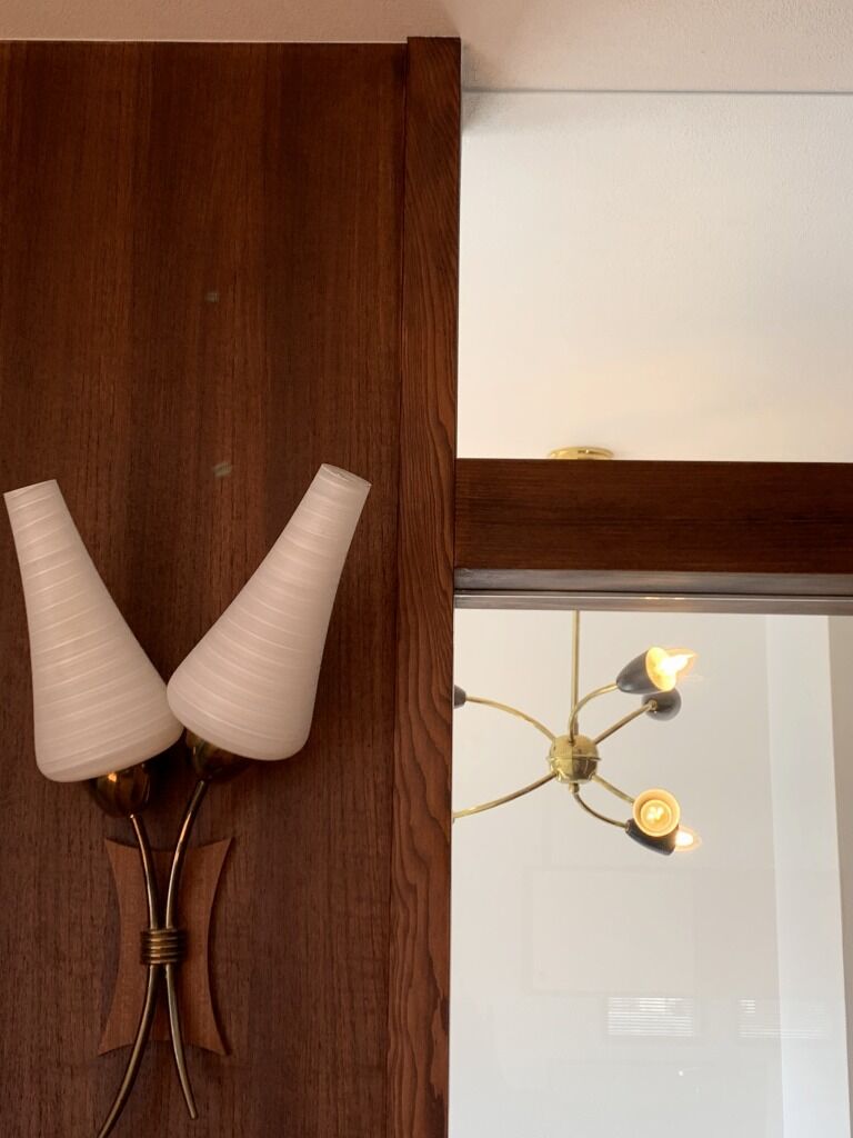 正確にはブラケットランプが白いガラスだったので、それを映えさせるためにしたのが、功を奏した空間です。リビングとの扉に付けたガラス部分からはスパイダーがのぞきます。