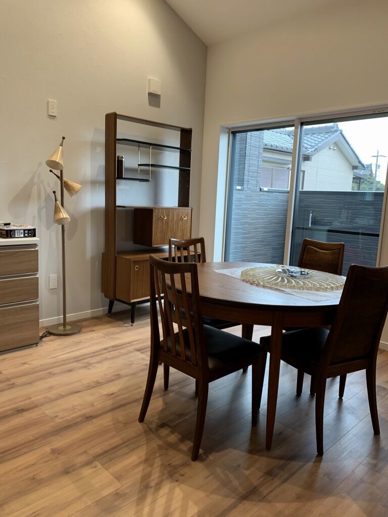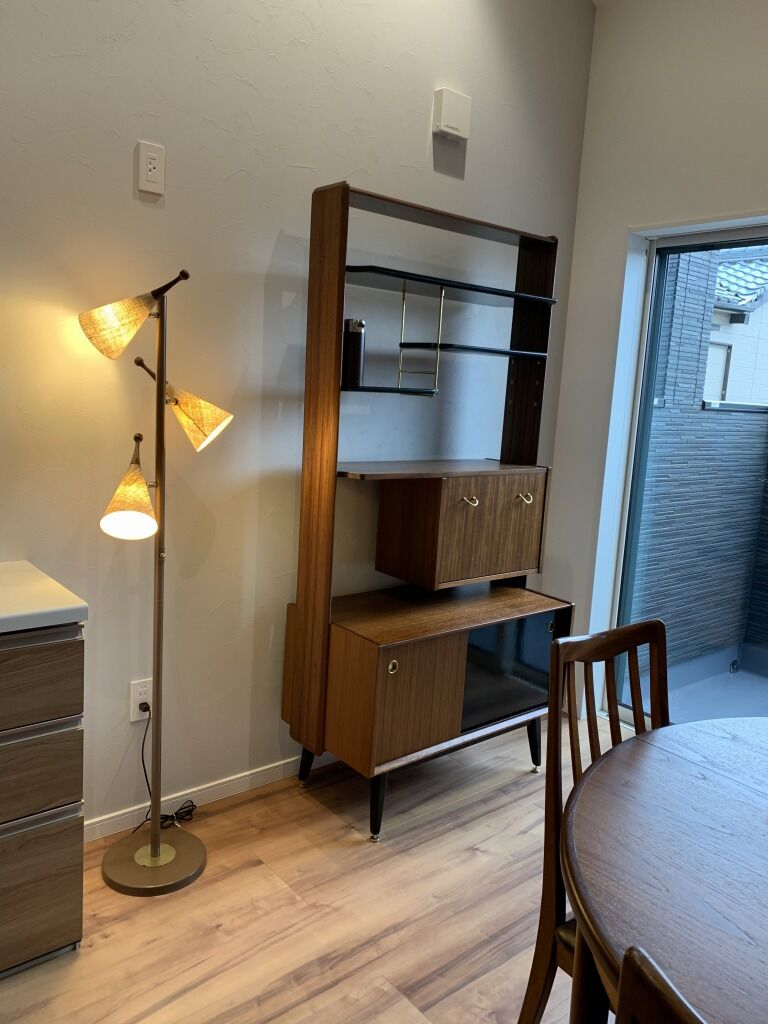 リビングダイニングの壁面にシェルフとフロアランプを。