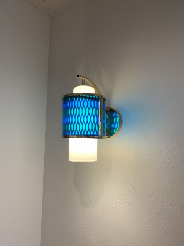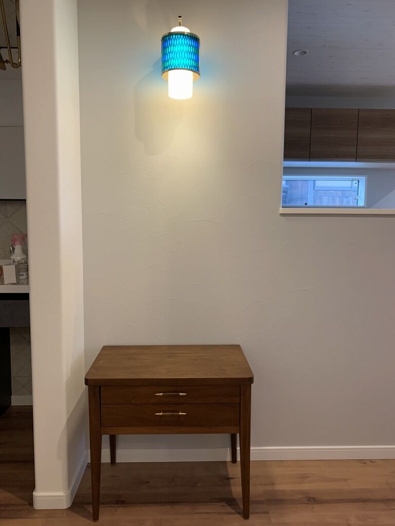 2Fリビングへの階段を上がった横(コンロの前の壁の裏)にナイトスタンドとその上にハニカム模様が透けるブラケットランプ。毎日LDKに入る際に出迎えてくれます。