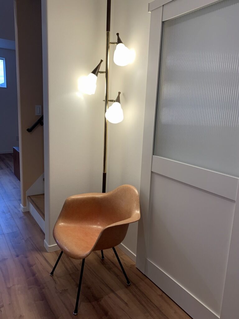 キッチンの前に少しスペースがあるので、イームズチェアとポールランプを。休憩したり、眺めて癒されたり。