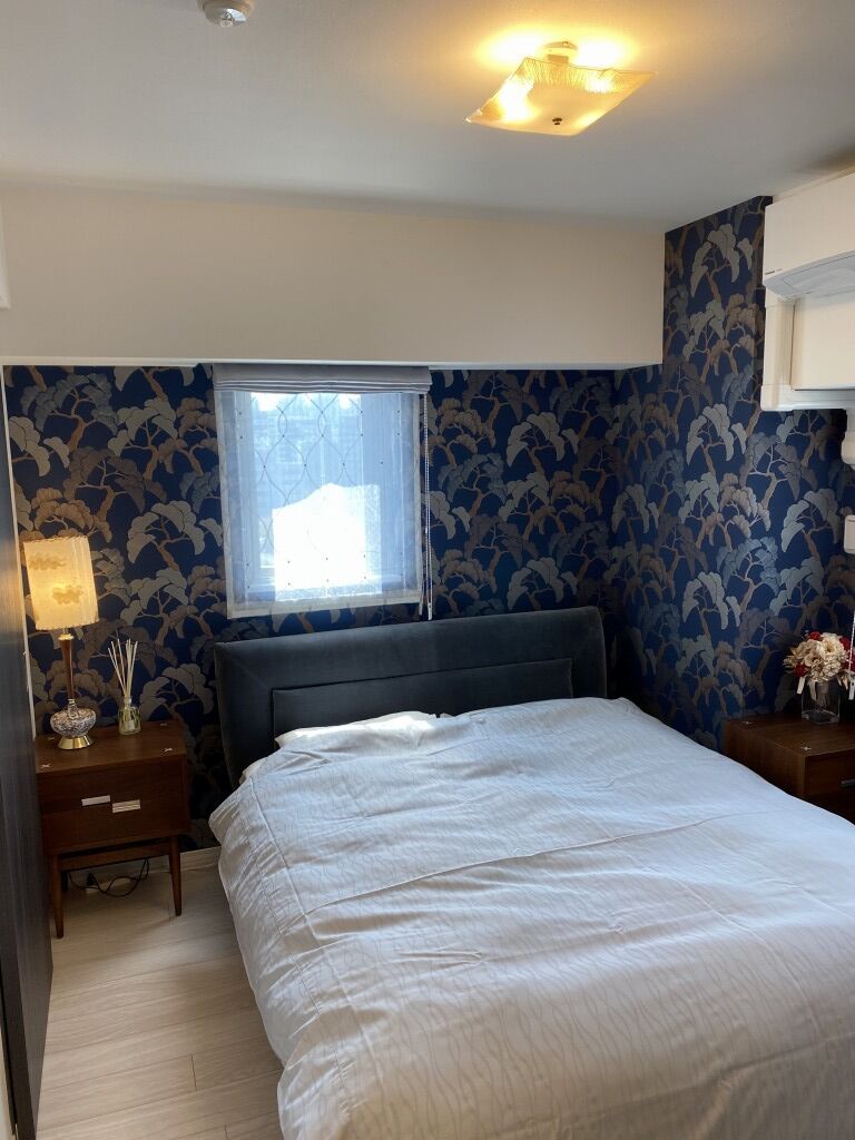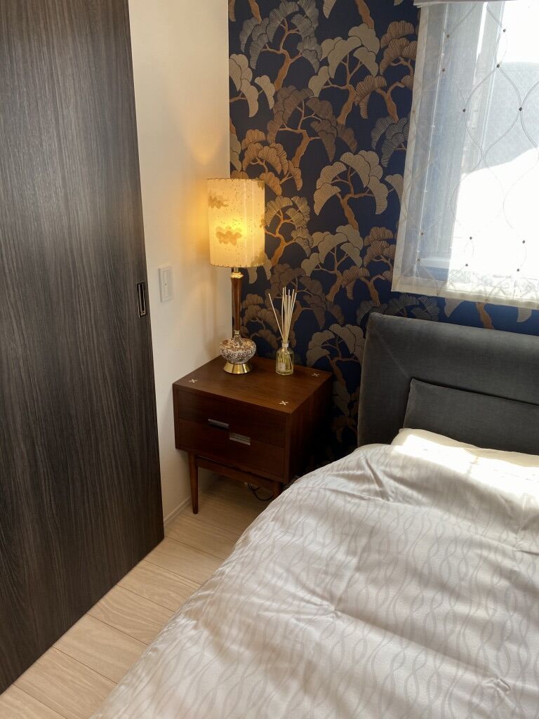 壁紙が素敵な寝室にはナイトスタンドとテーブルランプ、シーリングランプ。雲もようのランプシェードが妙に寝室っぽくてほっこりします。