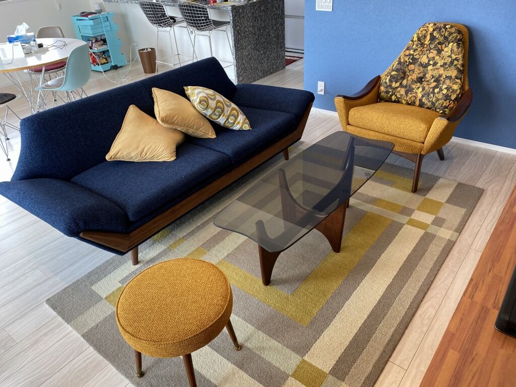 ゴロゴロだらしなく過ごすのに最適なソファがあり、見た目にも美しく座り心地が最高!なエイドリアン・ピアソールのシングルソファも。シングルと合わせたオットマンもあり、完璧です。