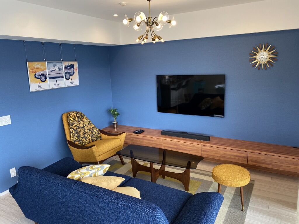 ブルーにマスタードイエローがアクセントのリビング。