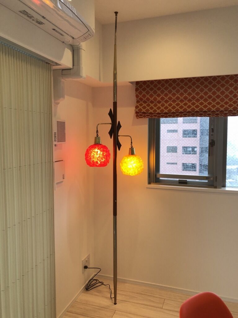 赤・オレンジの暖色がアクセントでワクワクします。角に設置されたスパゲティーのポールランプが視線を広げてくれます。