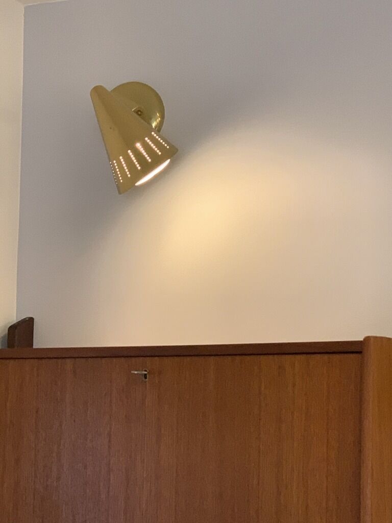 薄いグレーの壁にチークの家具が映えます。元々断捨離が好きな方なので収納面には問題がないそうです。そこにプラスアルファでブラケットランプのご提案もさせてもらいました。