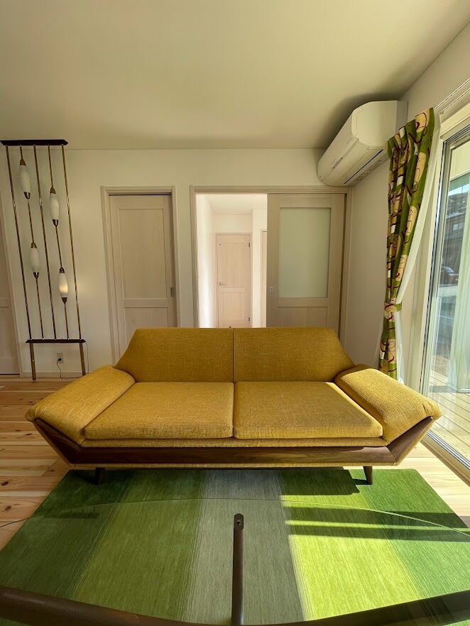まずリビングにはパームスプリングスのオリジナルソファ、テーブルはあのエイドリアン・ピアソールのガラステーブル(誰が名付けたのか通称スターバーストテーブルっていうらしい)を。