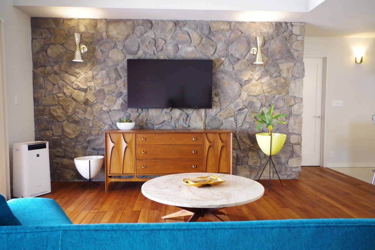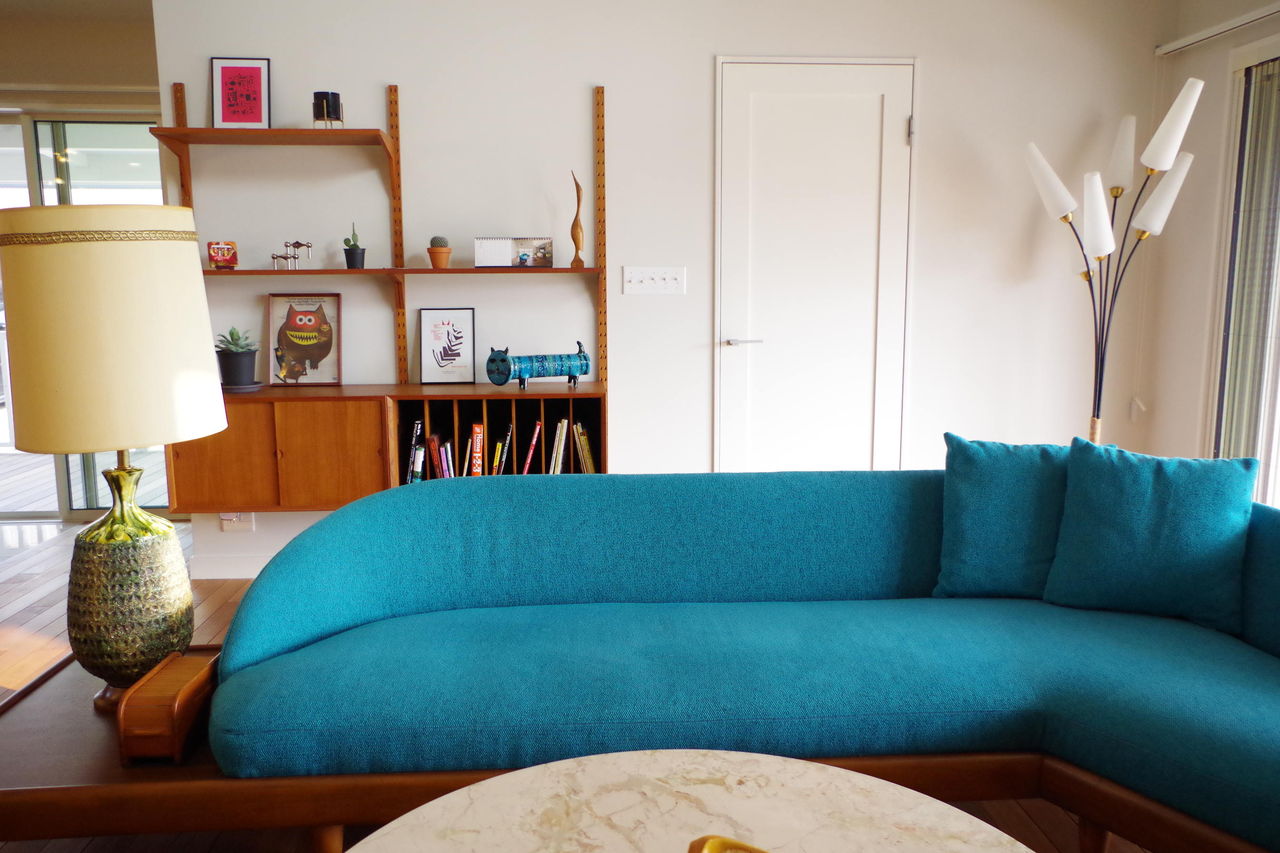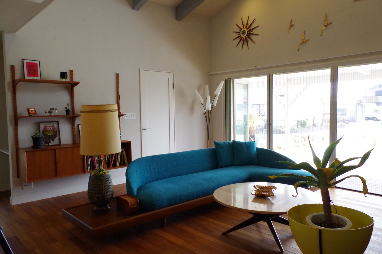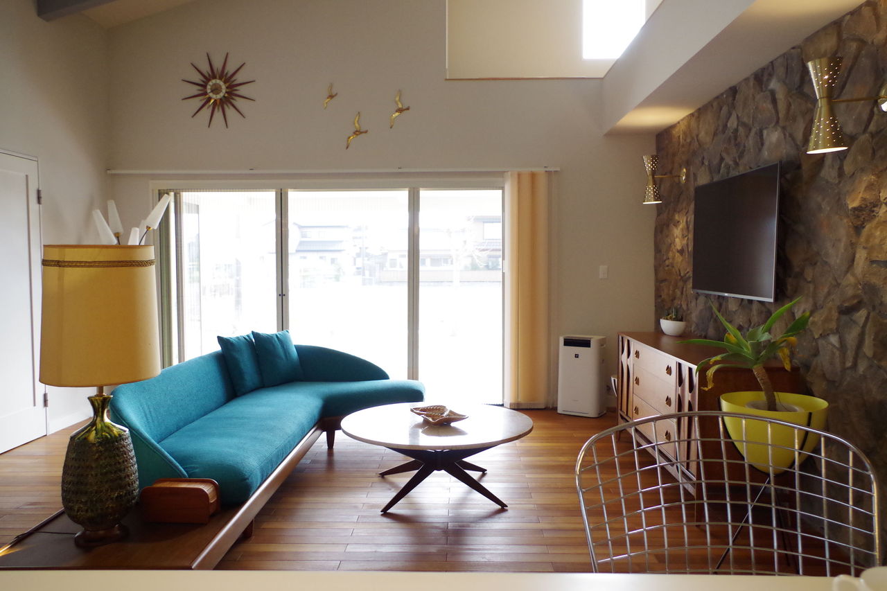 そしてメインソファの後ろは岩壁。パームスプリングスオリジナルソファのターコイズが岩のグレーに映えます。ソファの向きは全開する開口に向かって一旦配置。ソファは動かしてテレビに向かうこともできますね。